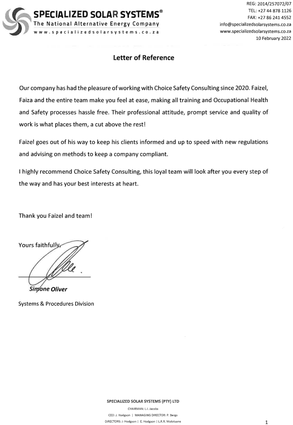 Our company has had the pleasure of working with Choice Safety Consulting since 2020. Faizel, Faiza and the entire team make you feel at ease, making all training and Occupational Health and Safety processes hassle free. Their professional attitude, prompt service and quality of work is what places them, a cut above the rest!